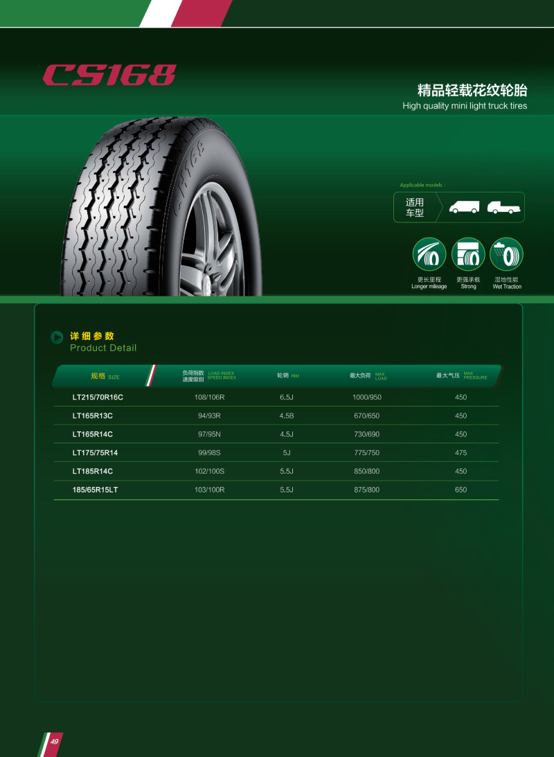 精品轻载花纹曲折的花纹沟槽加双层胎体结构,更强的承载力,深花纹设计提供卓越的耐久性能。