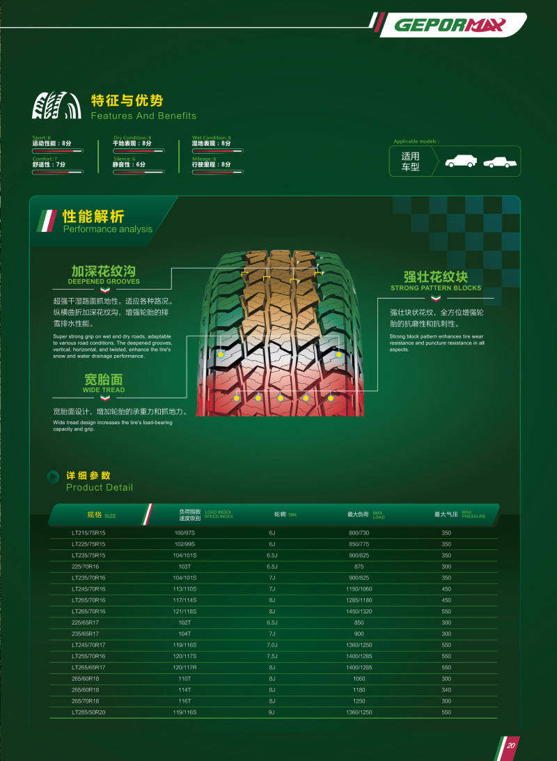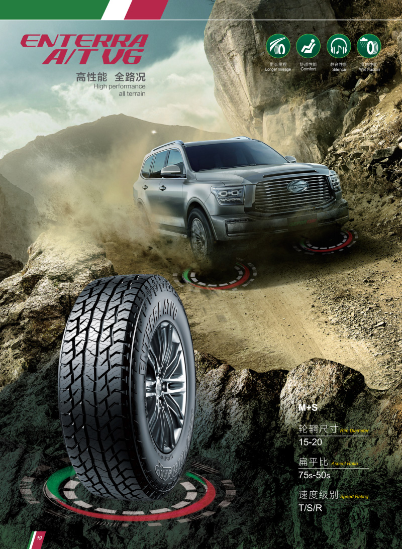 高性能越野轮胎,强壮花纹块和胎体,能适应各种恶劣路况。