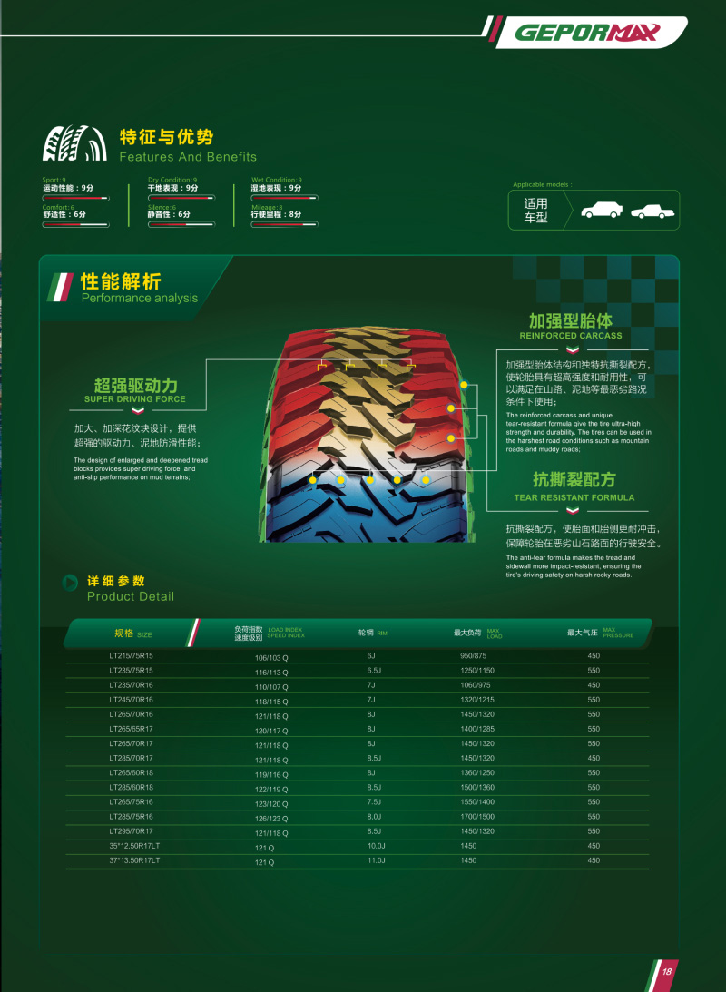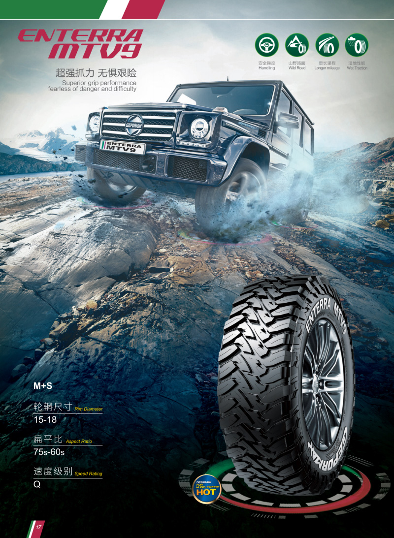 火焰型大块花纹,是一款用于极限越野的轮胎,恶劣路况下提供超强的驱动力、泥地防滑性能。