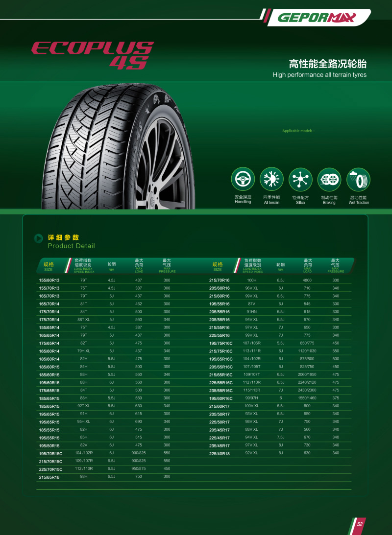 全季节轮胎,特殊胎面配方,适用雪泥地路况,有效防滑。