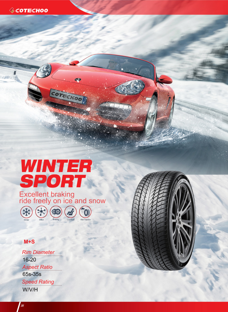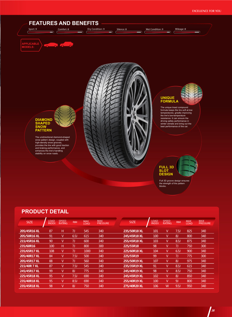 独特胎面胶料配方及花纹,为轮胎提供良好的牵引力和制动性能,可保证在冬季气候下的驾驶安全性能。