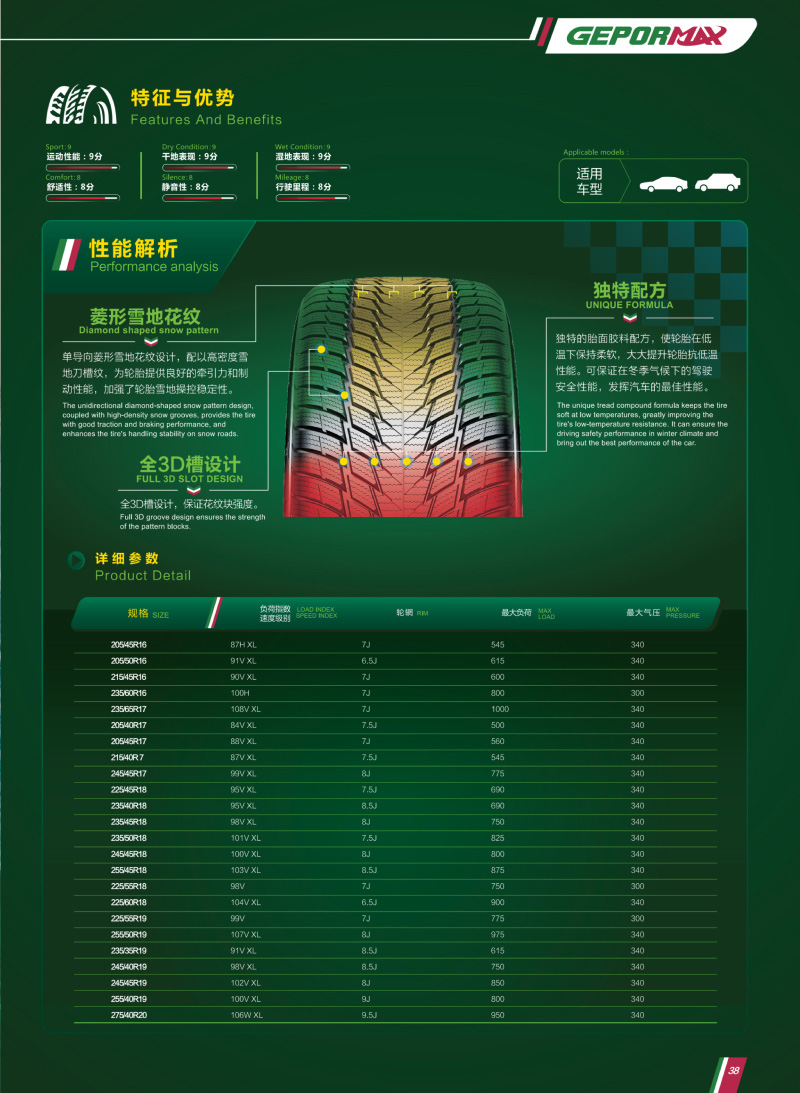 独特胎面胶料配方及花纹,为轮胎提供良好的牵引力和制动性能,可保证在冬季气候下的驾驶安全性能。
